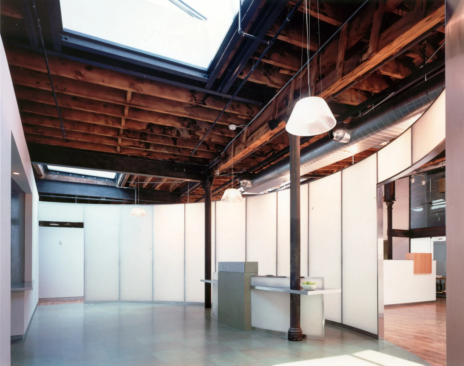The Saatchi brothers, Maurice and Charles, were launching their new agency in New York and were determined to have a workspace as unique and distinctive as the work that they created for their own clients. After a long search to find “just the right location”, they finally found a dramatic space on the top floor of a 19th century mercantile building in the Union Square area – a brick shell with cast iron columns and an intricate wood framed roof. It was decided early on that the best approach to the design of the space was one where there would be a strong and contrasting dialog between the old and the new, between the fussy and the minimal. This approach stretched the construction budget, created a wide range of design opportunities and contributed to our firm’s philosophy that, in renovations, what’s old should be old, what’s new should be new and both are made richer by the comparison.